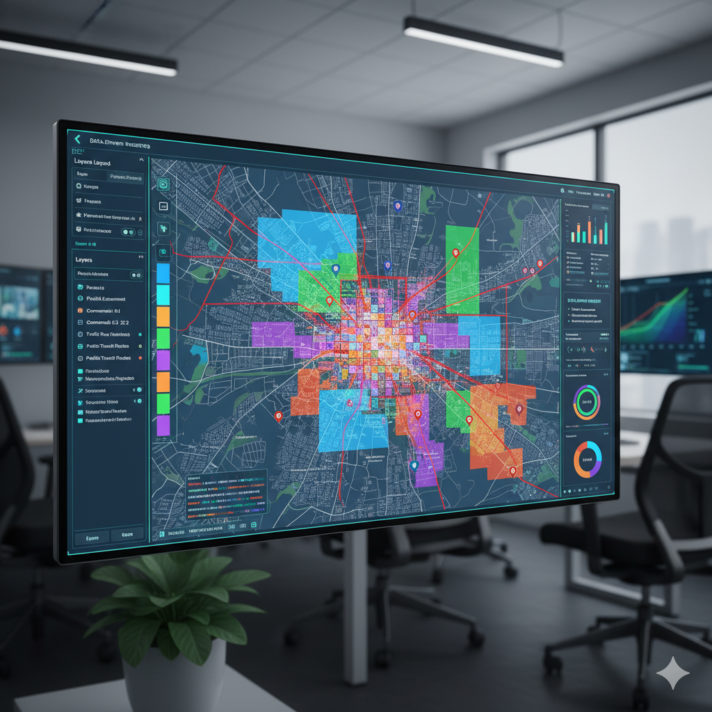 Modern workspaces with GIS data on transport and infrastructure.